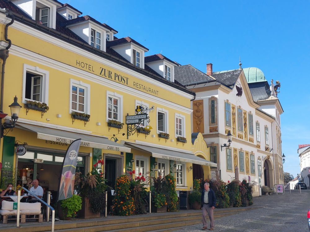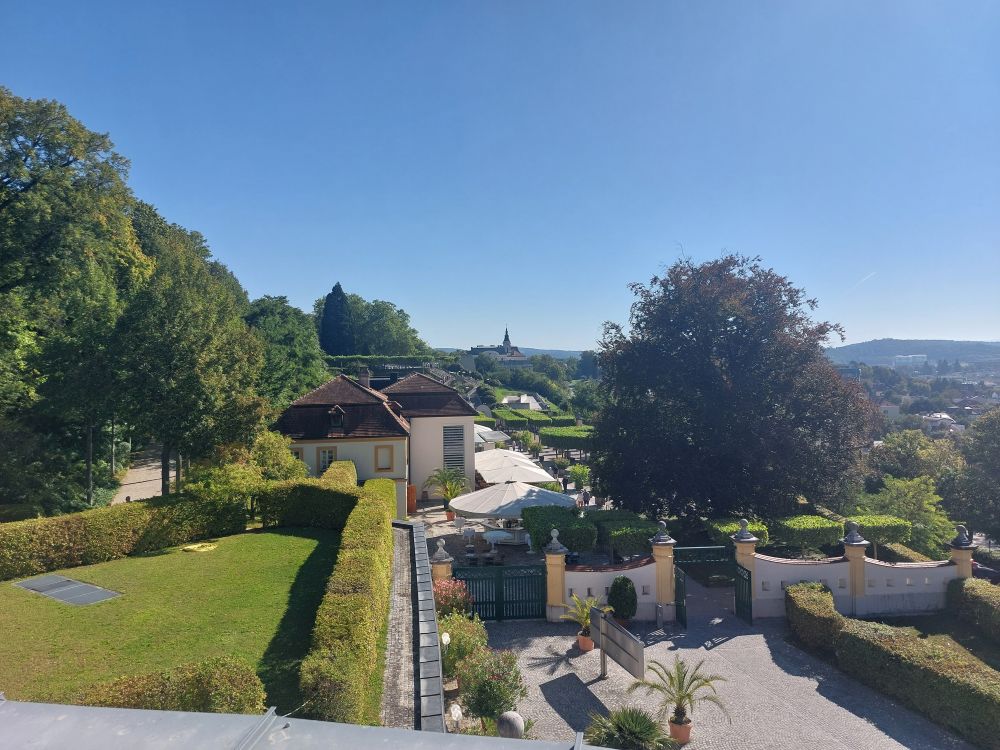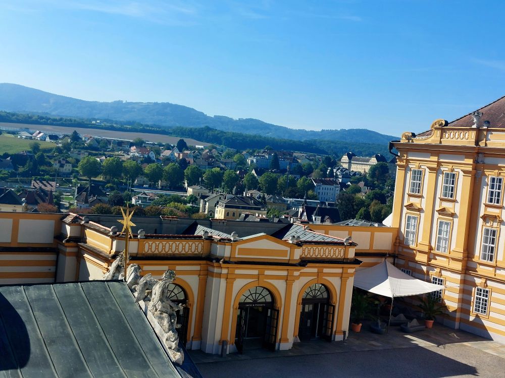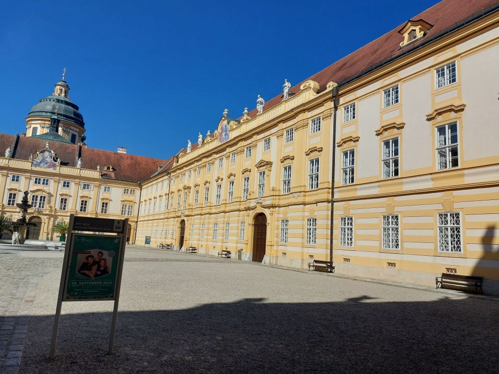 Wir schlendern durch die belebte Stadt und das schöne Wetter hat viele Menschen auf den Platz gelockt. Wir wollen hinauf zum Stift Melk, wieder bergauf 😊 Aber es sind nur ein paar Minuten und wir haben es geschafft. Dort oben sind die ersten Reisebusse angekommen und wir beschließen, uns das Kloster nicht anzuschauen, sondern uns statt dessen auf die Gartenanlage und der Aussichtsterrasse zu beschränken. Immer mehr Reisegruppen kommen an und wir machen wieder auf den Weg in die Altstadt hinunter. Wir genießen noch ein wenig die schöne Musik und gehen dann zum Womo.