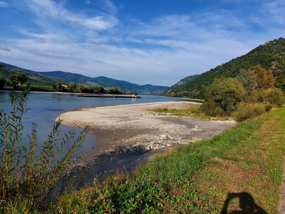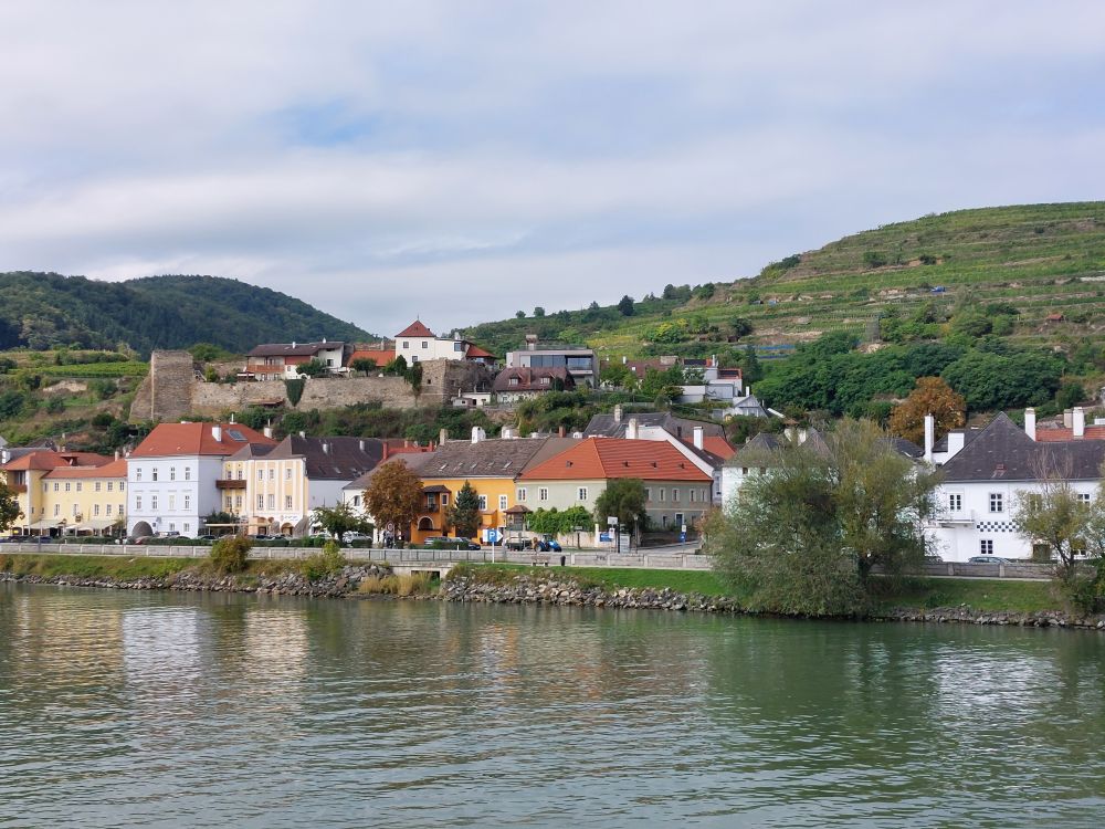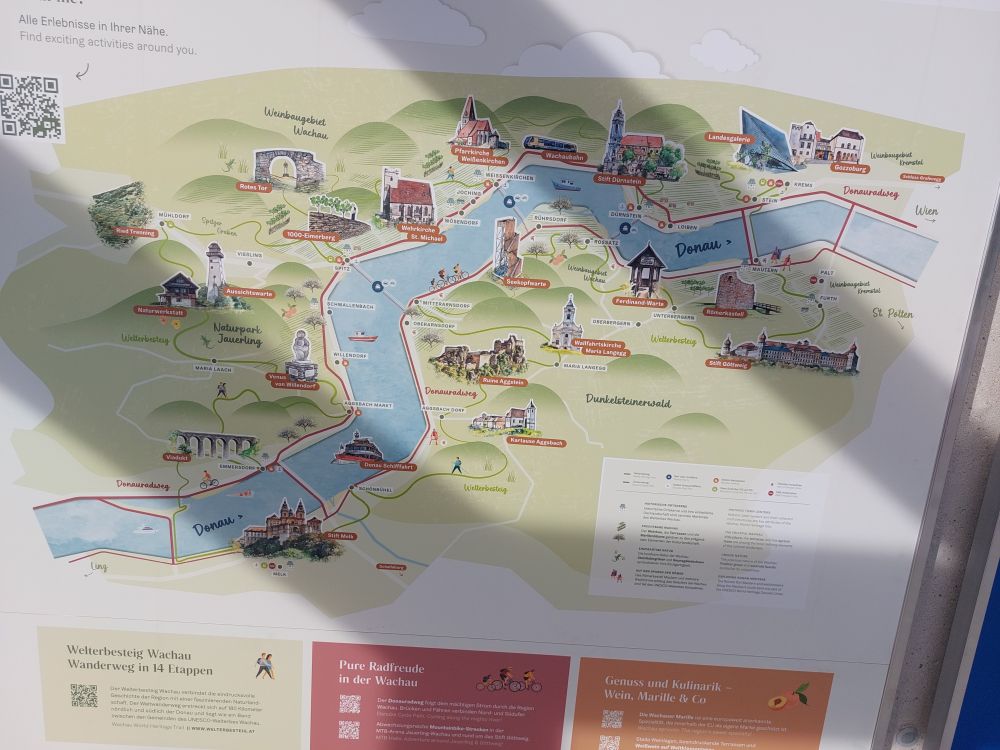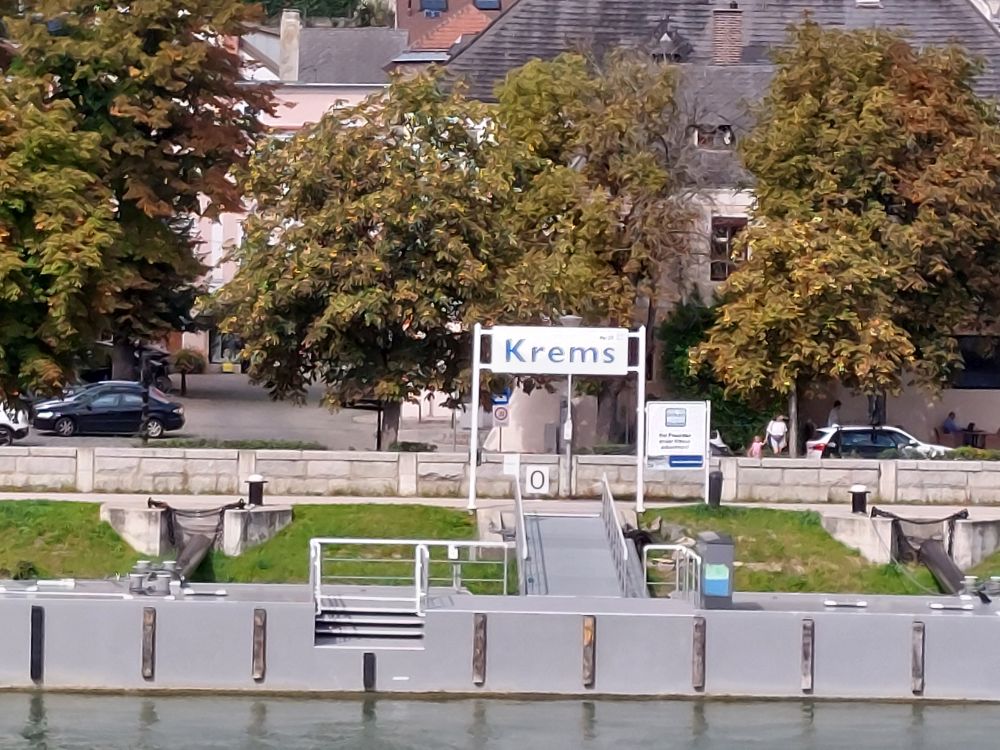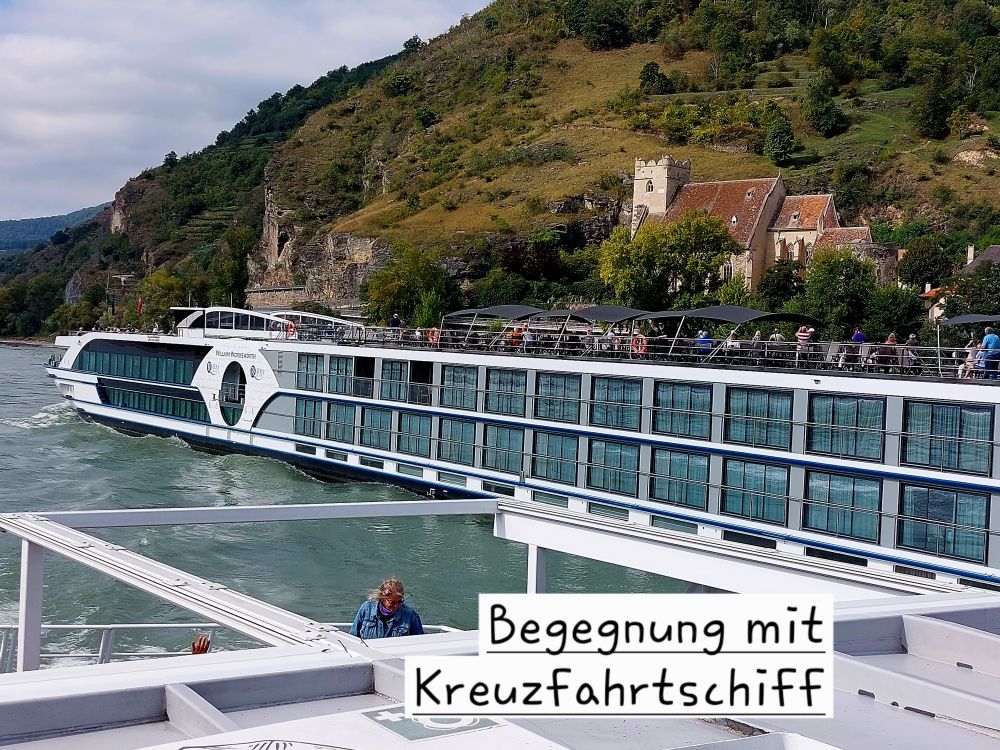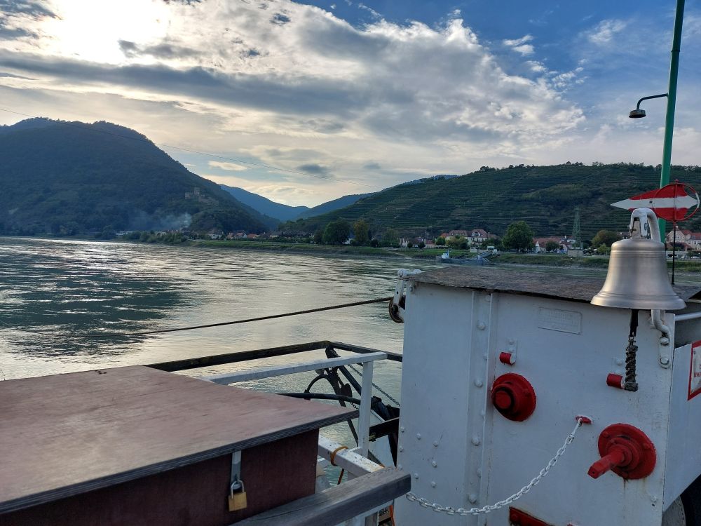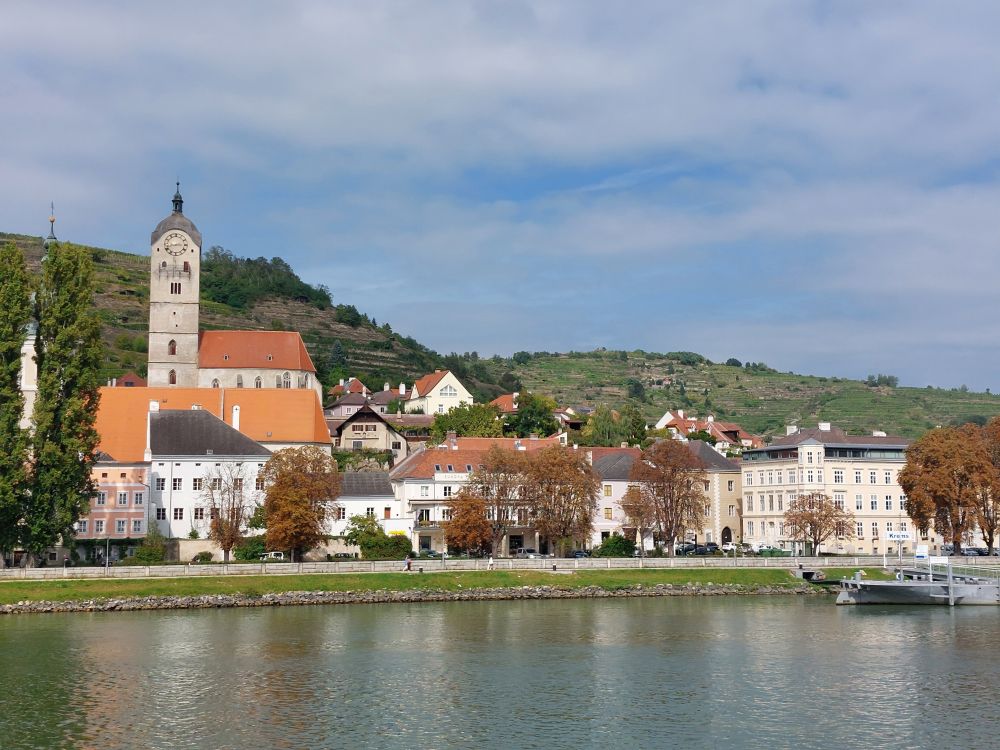 Heute Morgen ist es kühl und stark bewölkt. Aber lt. Wetter App soll die Sonne noch raus kommen. Wir starten um 10:00 Uhr mit dem Rad nach Spitz. Der Donauradweg führt erst an der Hauptstraße entlang, geht dann aber ein Stückchen hinauf in die Weinberge. Dort ist es sehr schön zu fahren. Nach 8 km sind wir in Spitz angekommen. Hier wollen wir mit dem Rad auf das Wachau Schiff um nach Krems zu fahren. Die Sonne ist auch schon da und wir freuen uns auf schöne 50 Minuten auf dem Wasser. Das Schiff ist sehr modern eingerichtet, für die Räder gibt es ein extra Abteil. Super. Nachdem die Räder verstaut sind, geht es hinauf zum Oberdeck. Bei schönstem Wetter genießen wir die langsame Fahrt durch die Wachau. In Dürrstein wird kurz angelegt um einige Ein- und Aussteigen zu lassen. Dann geht es weiter nach Krems.