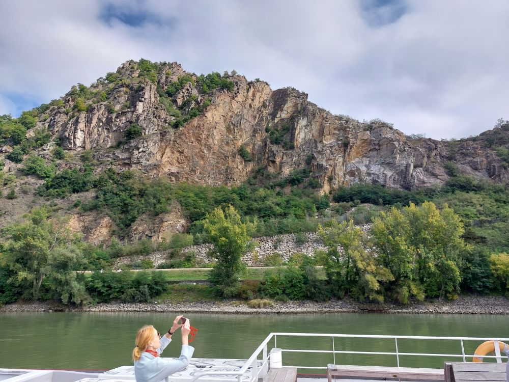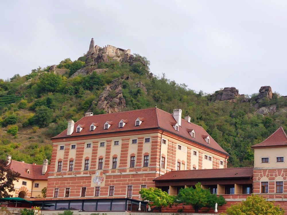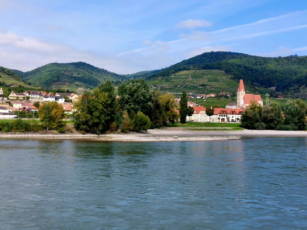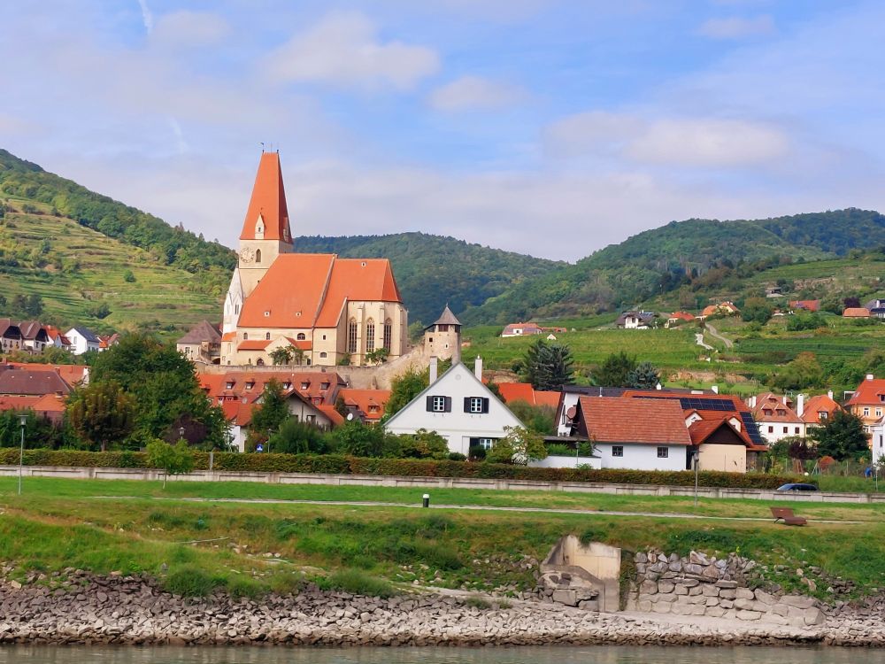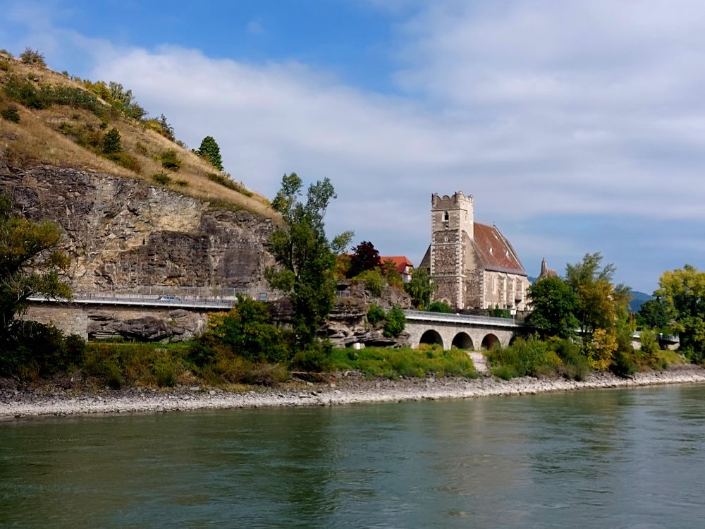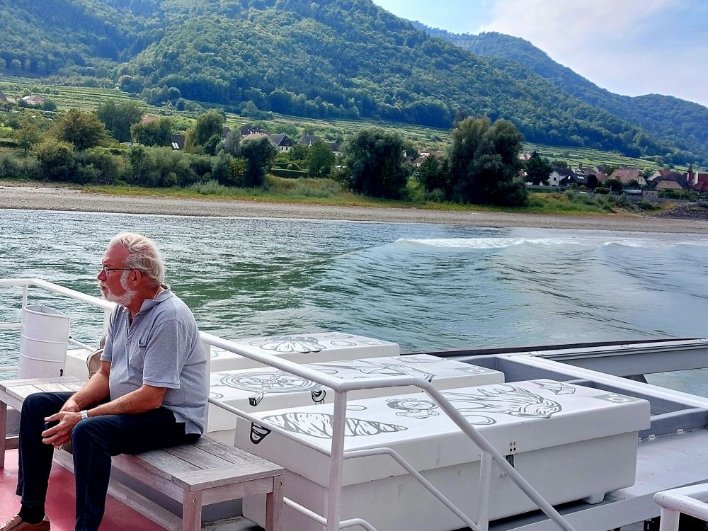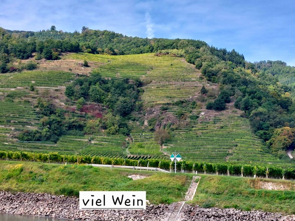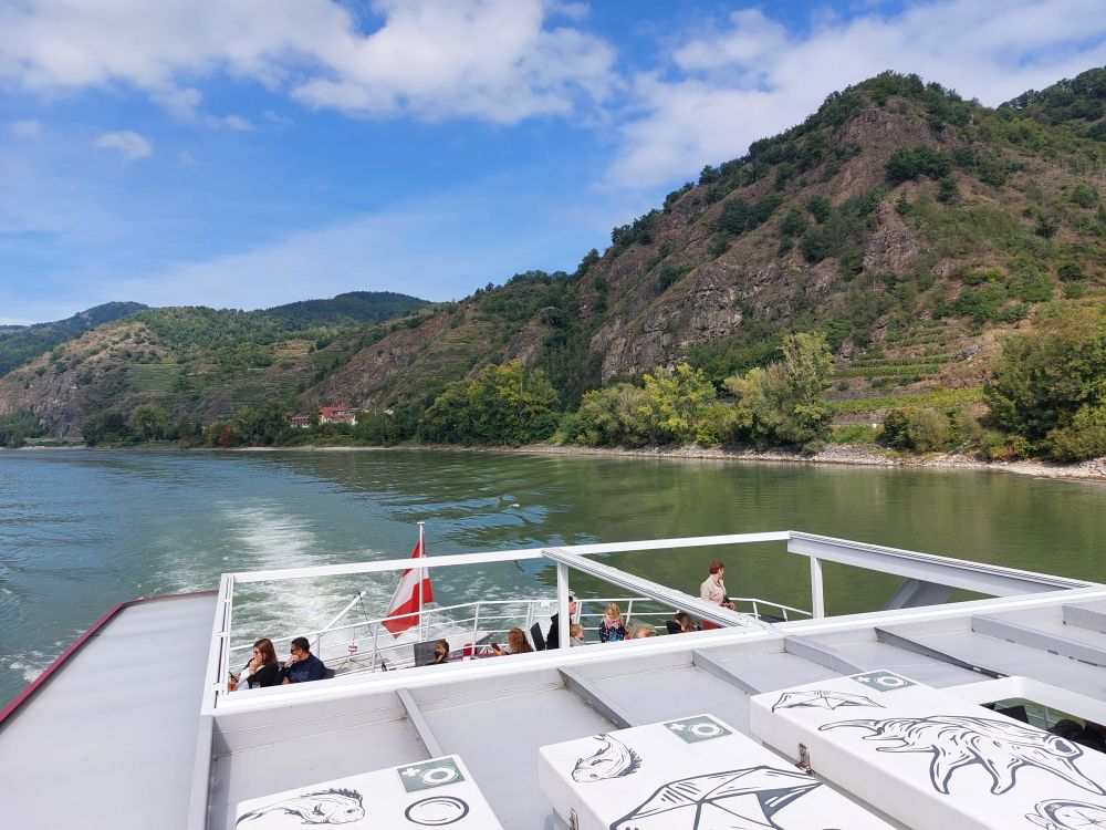 Heute Morgen ist es kühl und stark bewölkt. Aber lt. Wetter App soll die Sonne noch raus kommen. Wir starten um 10:00 Uhr mit dem Rad nach Spitz. Der Donauradweg führt erst an der Hauptstraße entlang, geht dann aber ein Stückchen hinauf in die Weinberge. Dort ist es sehr schön zu fahren. Nach 8 km sind wir in Spitz angekommen. Hier wollen wir mit dem Rad auf das Wachau Schiff um nach Krems zu fahren. Die Sonne ist auch schon da und wir freuen uns auf schöne 50 Minuten auf dem Wasser. Das Schiff ist sehr modern eingerichtet, für die Räder gibt es ein extra Abteil. Super. Nachdem die Räder verstaut sind, geht es hinauf zum Oberdeck. Bei schönstem Wetter genießen wir die langsame Fahrt durch die Wachau. In Dürrstein wird kurz angelegt um einige Ein- und Aussteigen zu lassen. Dann geht es weiter nach Krems.