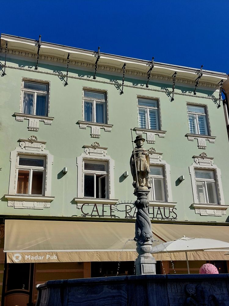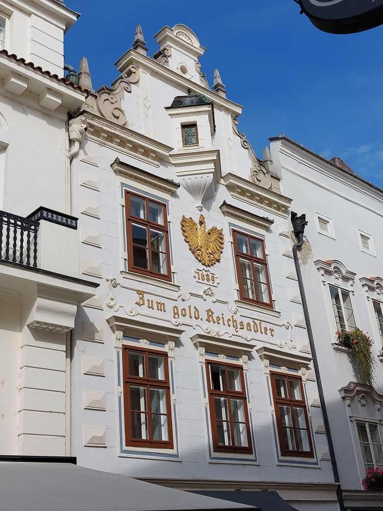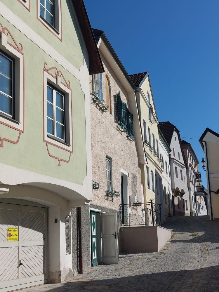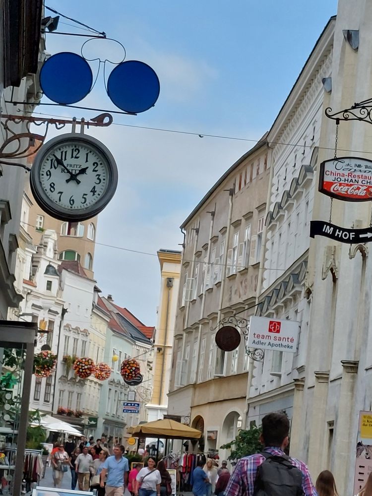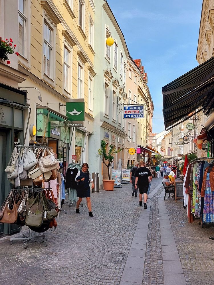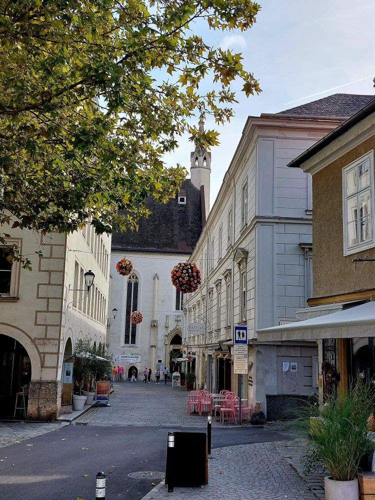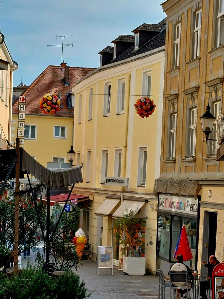 Wir stellen unsere Räder direkt in der Nähe vom Schiffsanleger ab und gehen zu Fuß in die Altstadt. Ein Fehler, wie wir bald merken, denn der Weg zur Altstadt ist doch recht weit. Aber als wir dann die Altstadt erreichen, sind wir begeistert. Wieder eine schöne Stadt, und überall ist reges Treiben, ohne das es stressig wirkt. Wir finden einen netten Platz, um Mittagspause zu machen. Leute beobachten, bis das Essen kommt…es ist einfach nur schön. Micha bestellt sich Käsespätzle und ich Schinkenfleckerl. ( Ich musst erst einmal nachfragen, was das ist: Fleckerl sind Nudeln 😊 ) Es schmeckt uns sehr gut und wir schlendern frisch gestärkt noch ein wenig weiter, um dann zum Bike zurück zu gehen.