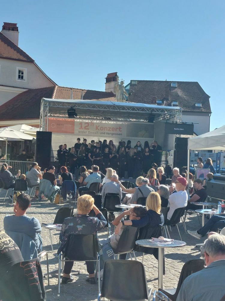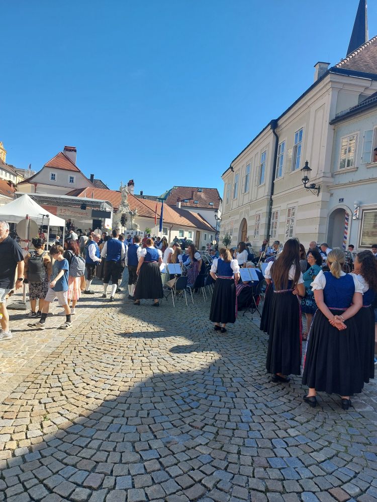 Wir finden einen großen Parkplatz direkt am Bahnhof, nur ein paar hundert Meter von der Altstadt entfernt. Auch hier in Melk wird gefeiert: Es gibt den ganzen Tag hier Konzerte mit folgendem Motto: wider Gewalt und vergessen. 2 Bühnen sind aufgebaut und wir werden in der Stadt mit Musik von Schülern der Musikschule empfangen. Klasse.