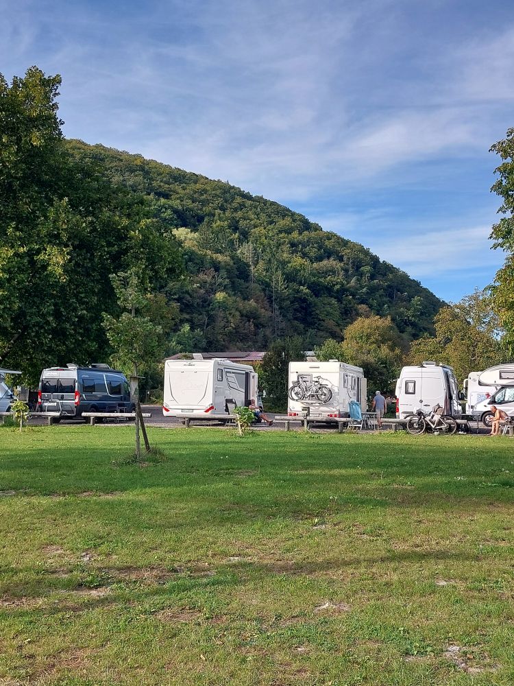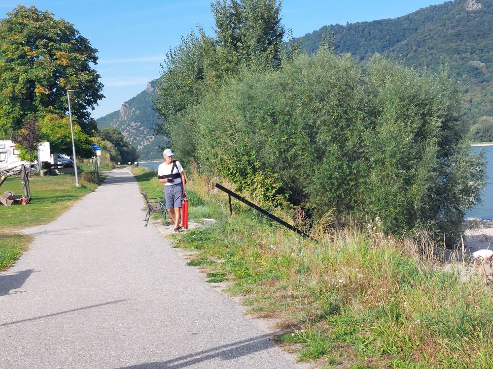 Noch 13 km und wir sind an unserem heutigen Ziel: Aggsbach Markt, dort ist ein Stellplatz direkt an der Donau. Da auch dieser Platz dicht an der Hauptstraße liegt, ist tagsüber Autoverkehr zu hören, aber dafür direkt am Donauradweg. Den wollen wir morgen befahren.