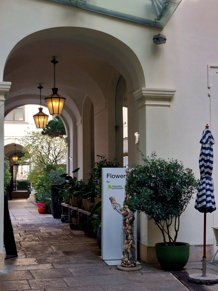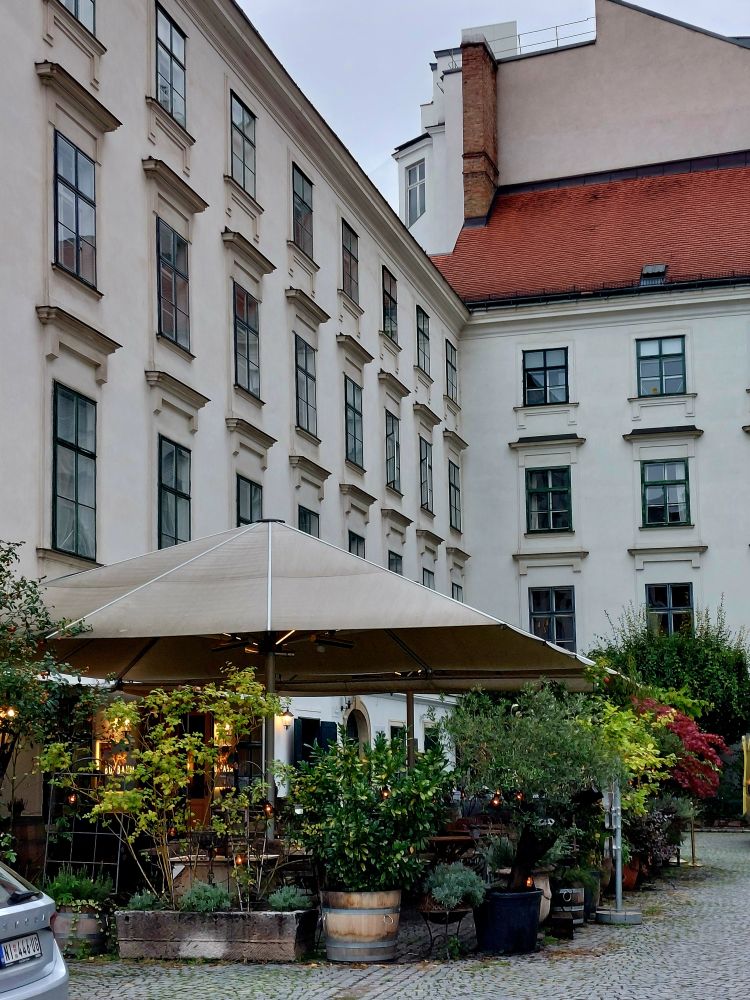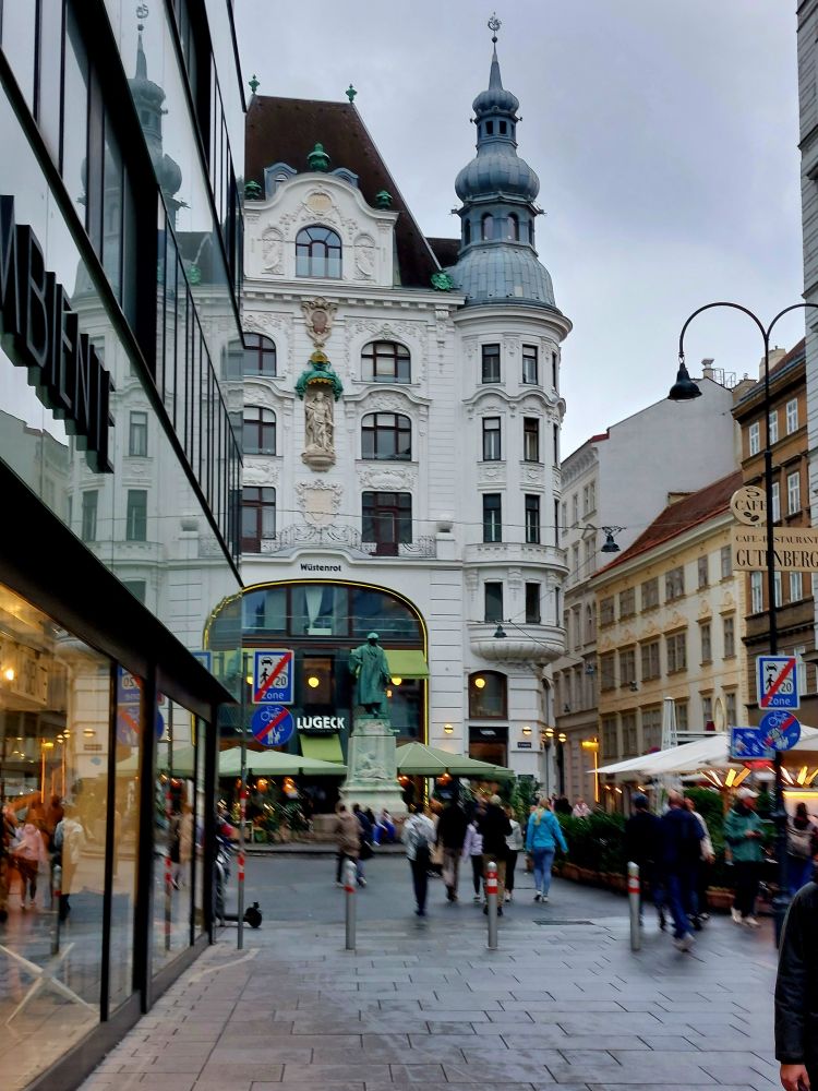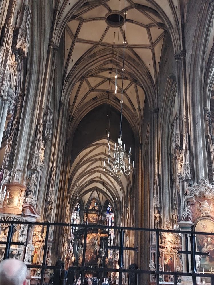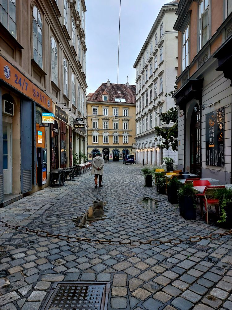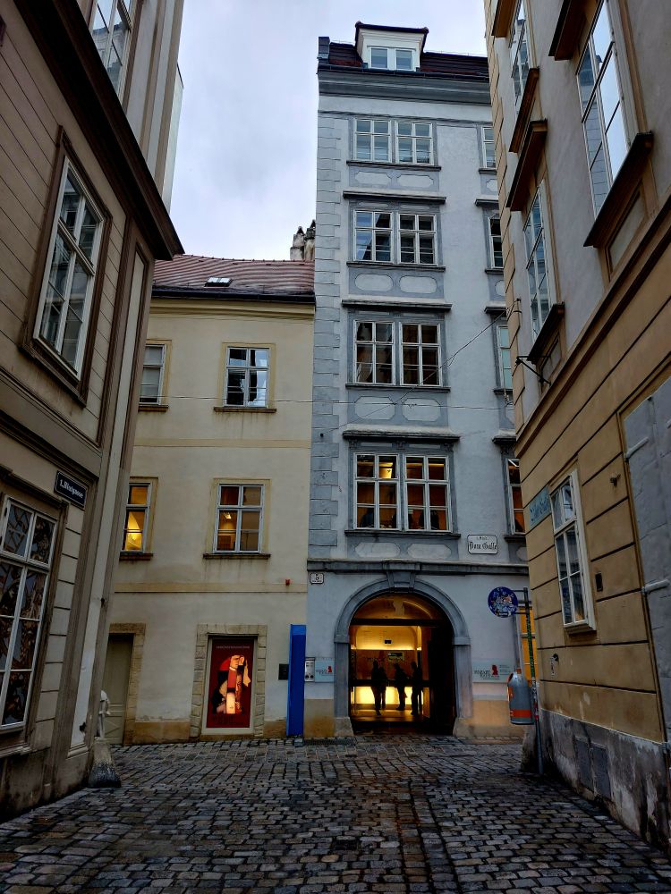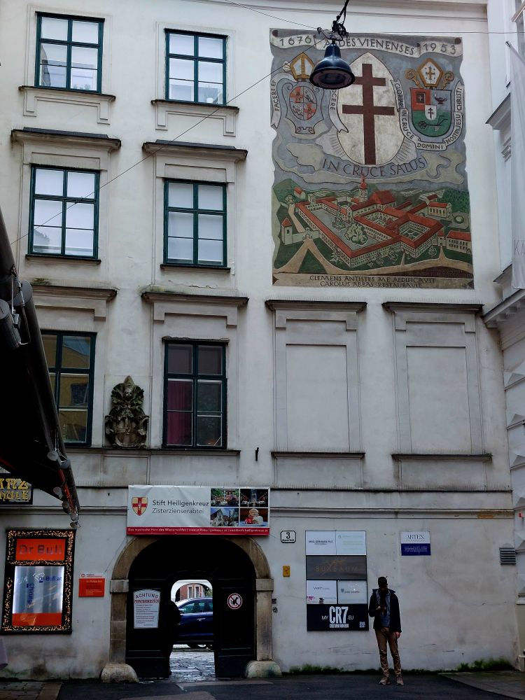 Leider ist immer noch schlechtes Wetter, aber ich beschließe, noch ein wenig in Wien herumzuschlendern. Ich fahre mit der U4 bis Karlsplatz und steige dann in die U1 bis Stephansplatz. Dort tobt das Leben, es ist rappelvoll. Ich gehe zwar in den Dom hinein, mache aber nur am Eingang ein paar Bilder, Eintritt zu bezahlen bin ich nicht bereit. Ich war mit Marlies und Gabi 2013 bereits einmal ausgiebig im Dom, das muss ich nicht widerholen. Dafür zünde ich aber für Jochen und Heidi eine Kerze an. Jochen (der Mann von meiner Freundin Heidi) wurde heute neben seiner Heidi beigesetzt. Als ich den Dom verlasse, nehme ich meinen Marco Polo Reiseführer und folge den Spaziergangweg, der dort beschrieben ist. Nach einigen Metern stelle ich fest, das dieses der Weg ist, den ich auch mit Marlies und Gabi, in Begleitung einer Stadtführerin gemacht habe. Es geht z.B. zum Heiligenkreuzerhof.