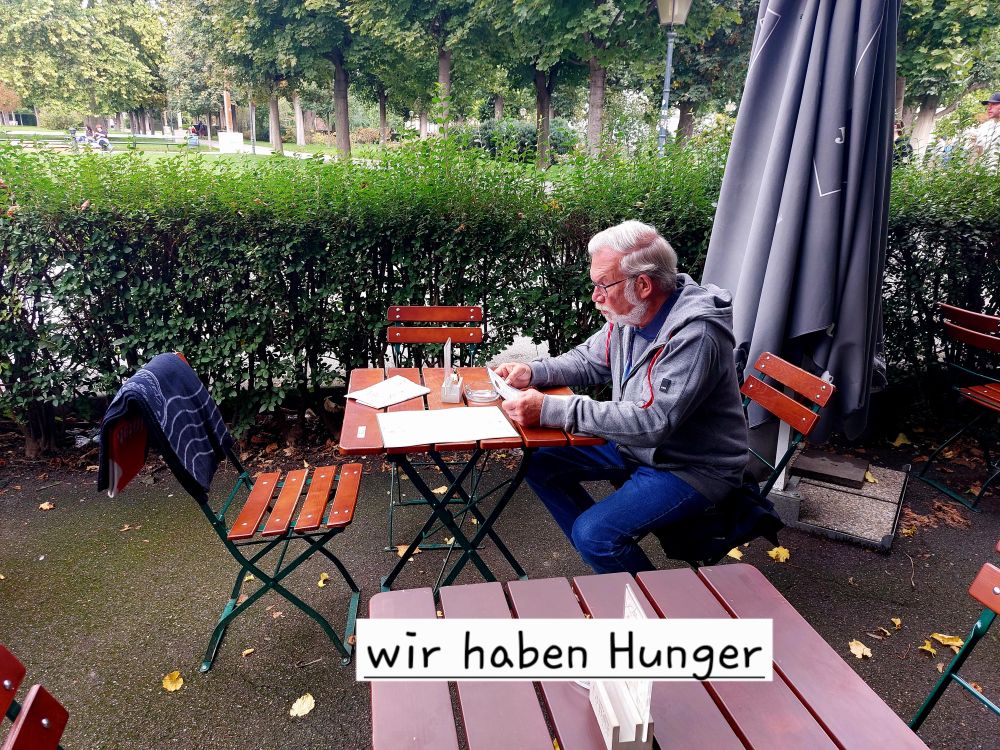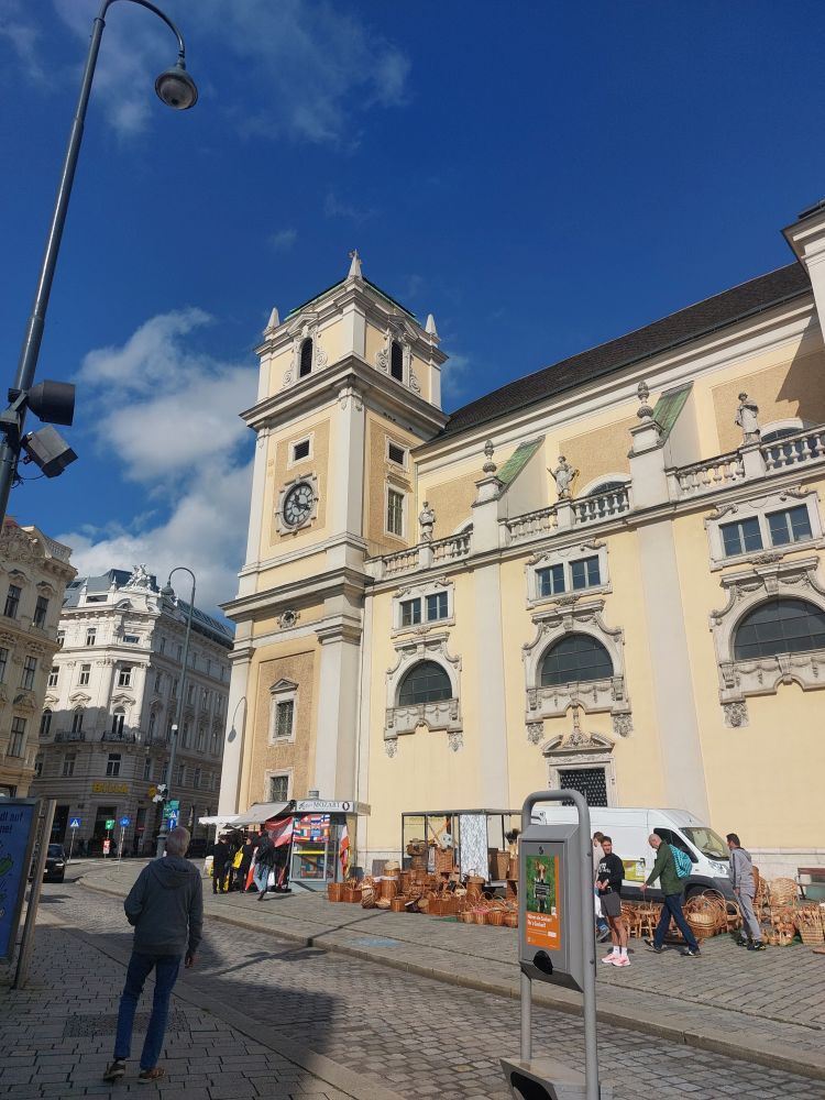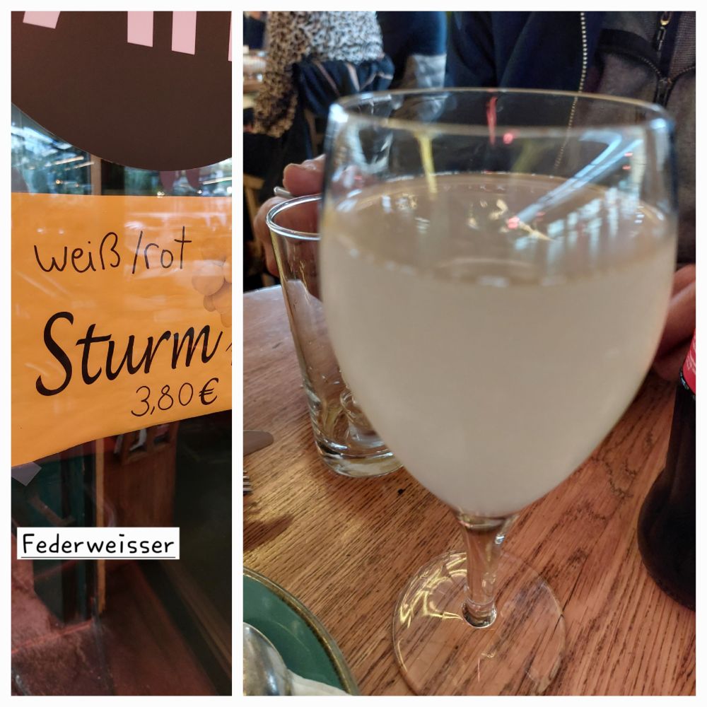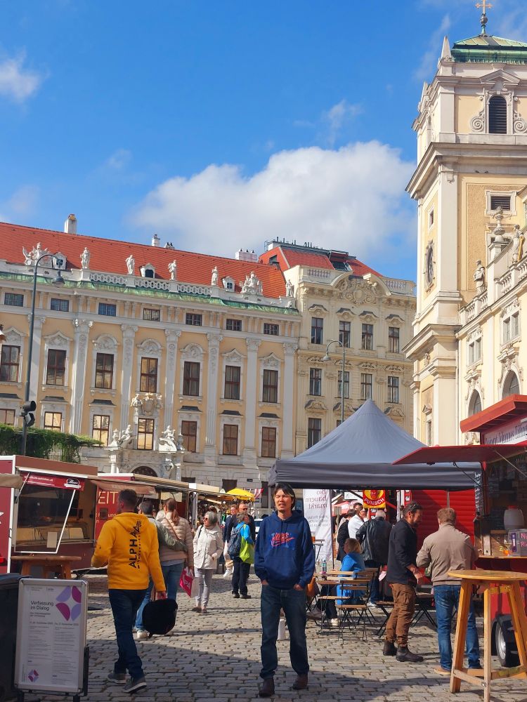 Morgens regnet es noch, aber ab 11 Uhr hört der Regen auf und wir machen uns auf den Weg zum Schloss Schönbrunn. Dazu fahren wir erst 20 Minuten mit dem Bus nach Wien um dann in die U Bahn umzusteigen. Wir steigen am Karlsplatz aus, denn hier in der Nähe beginnt der Naschmarkt, den wir uns anschauen möchten. Es gibt viele Leckereien, Fisch, Gewürze, Süßigkeiten, Obst- und Gemüse und viele kleine Lokale, die Mittagstisch anbieten. Das passe, denn es ist 13Uhr und wir bekommen Appetit. Gut, dass man hier geschützt drinnen sitzen kann, denn draußen ist es einfach zu kalt. ( 15 Grad) Wir bestellen uns ein Menue: Vorspeise Kohlrabicremesuppe, die sehr gut gewürzt ist und als Hauptgericht bestellt Micha sich Nudeln mit Steinpilzsauce, während ich Rindfleisch mit Wokgemüse und Reise bestelle. Beides schmeckt uns sehr gut. Ich möchte endlich den Sturm probieren ( so heißt hier der Federweisser) und finde, das er gut schmeckt.