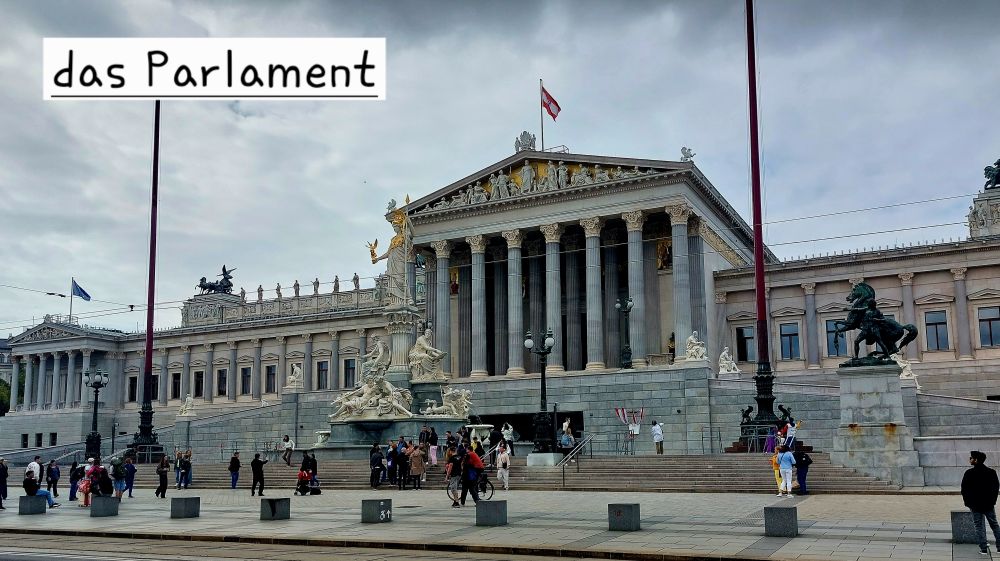 Dann gehen wir am Rathaus und am Parlamentsgebäude vorbei zur Straßenbahn.